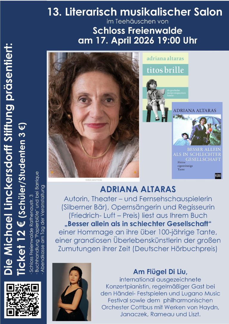 Liebe Freundinnen und Freunde bitte beachten Sie, dass für diesen dritten Salon nur 50 Tickets zum Preis von zwölf Euro zur Verfügung stehen - sichern Sie und Ihre Freunde sich rechtzeitig den am 15. März. Tickets wie immer bei Papierblüte, Barrique, im Schloss und bei der Tourismusinformation. Letztmalig gilt bei diesem 3. Salon das Prinzip, dass nach dem Erwerb einer Kaufkarte die Bestellung einer Freikarte über den QR Code der Stiftung möglich ist. Jugendliche und Studenten erwerben ihr Ticket für drei Euro.